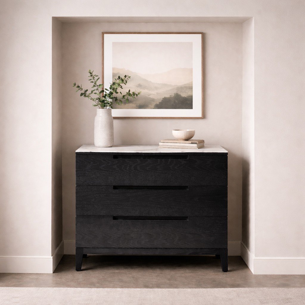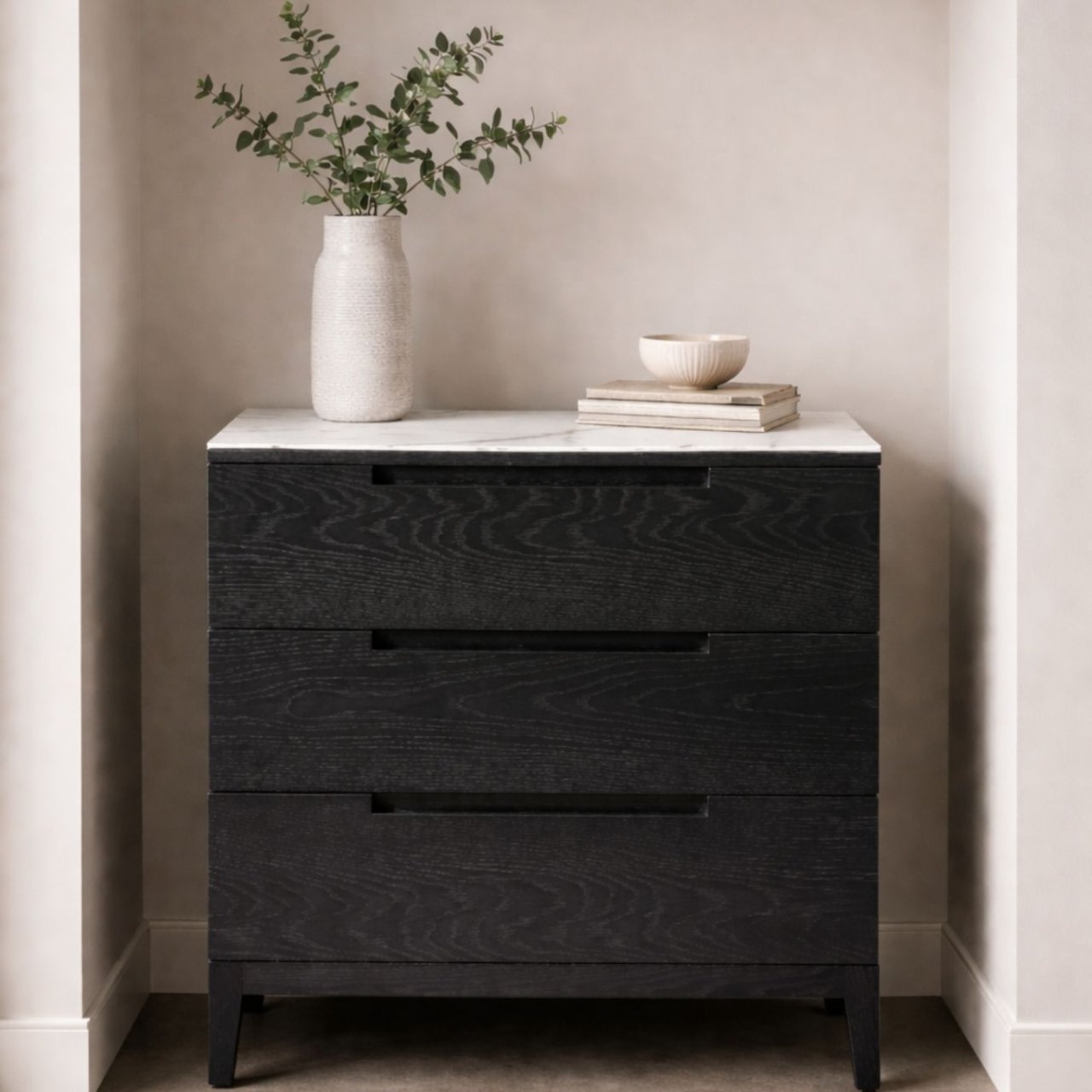 The Orchid Marble Chest is beautiful and luxurious in colour, with a detailed marble top. Consisting of three large drawers with stylish cut out handles and a robust black oak frame, this chest works wonderfully in contemporary spaces. Its smooth and detailed sleek marble top adds a sense of luxury to your bedroom.