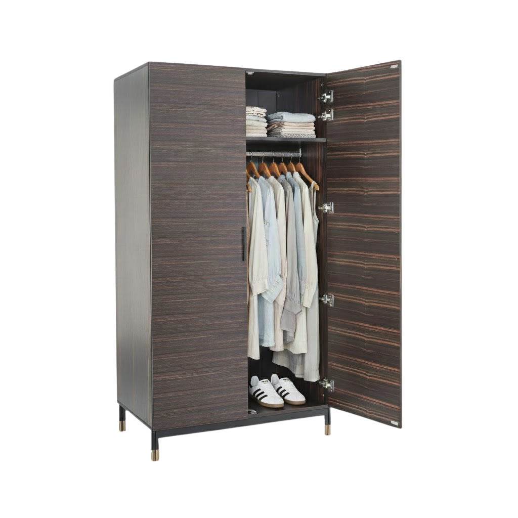 The Bali Wardrobe is a beautiful product with a unique ebony veneer finish. Its attention to detail is remarkable, with its contrasting striped design and bold black metal frame, finished with polished brass caps.