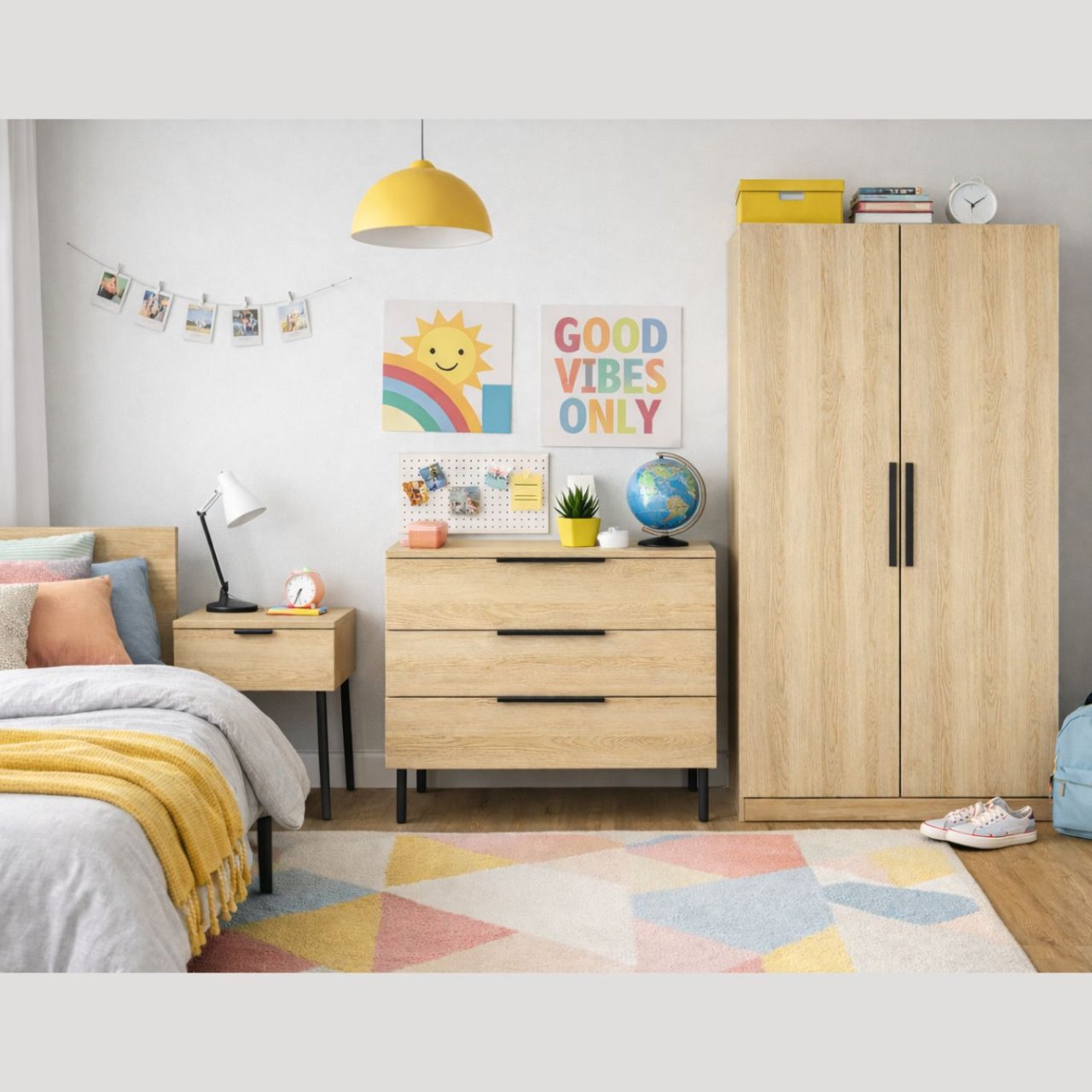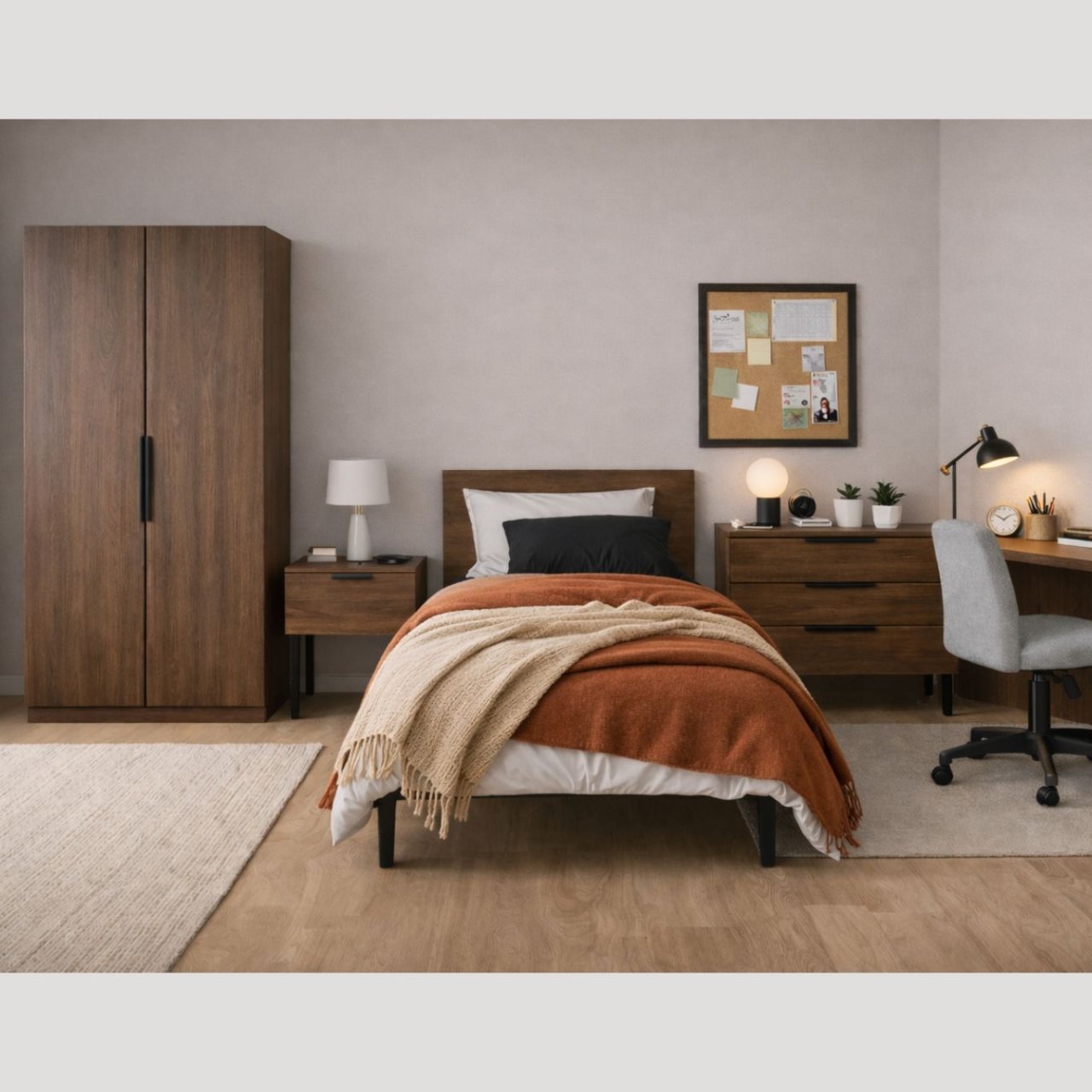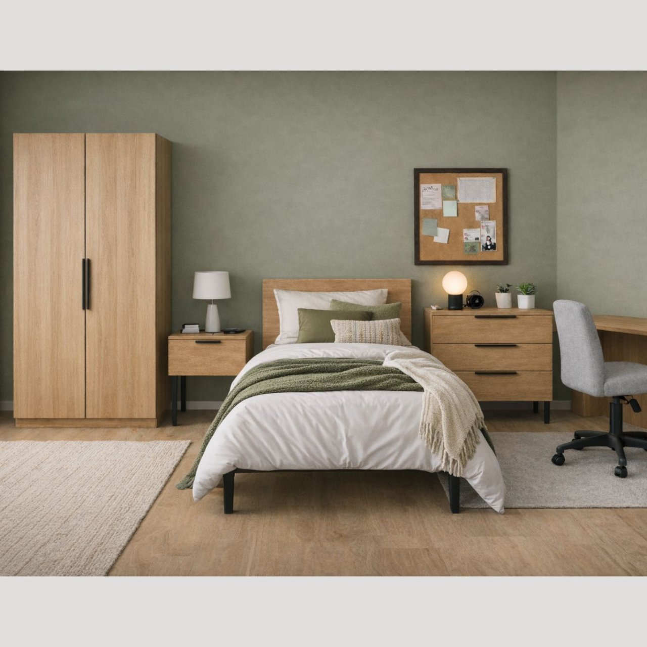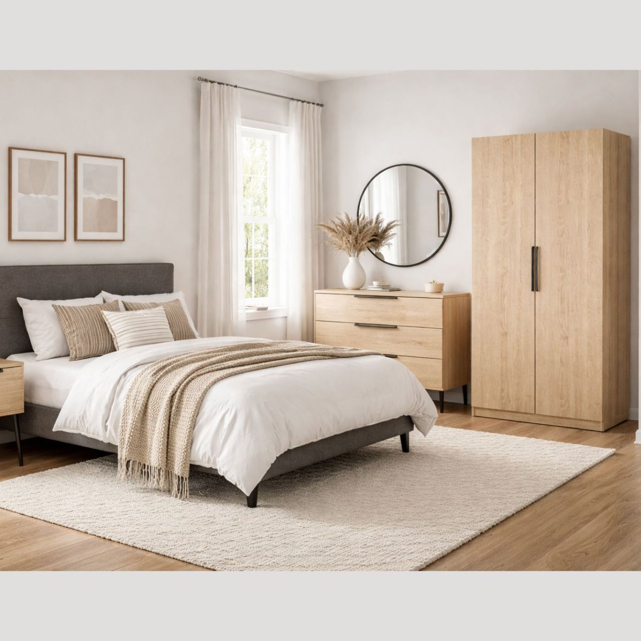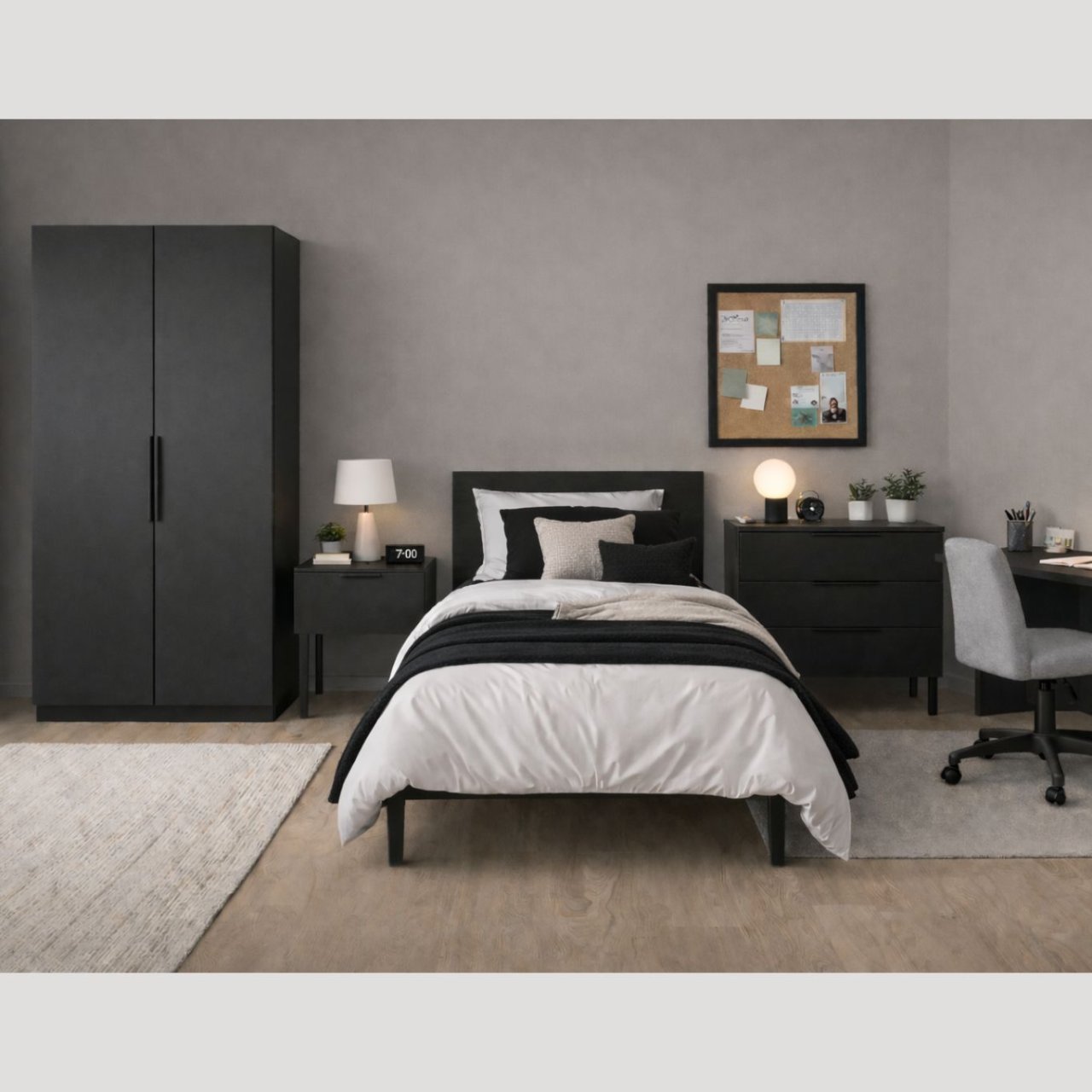 The Luna Wardrobe is ideal for smaller spaces and bedrooms with single occupants. Its doors feature soft-close hinges and sleek, matt black powdered metal handles. The interior of the wardrobe is minimalist, with a hanging rail and shelf above it. Easily accessible, the top of the wardrobe can also be used for extra storage. Designed with durable, sustainable materials, it is a functional and environmentally conscious solution.