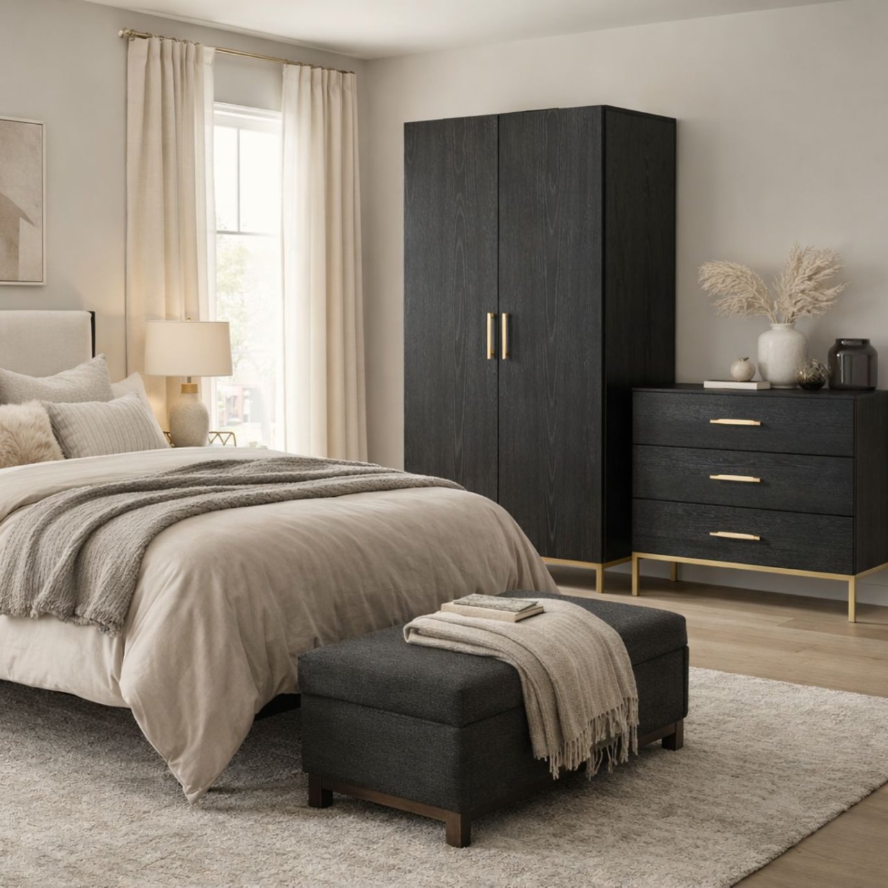 The Tulip 2 Door Wardrobe not only adds elegance to your bedroom, but also offers plenty of storage space for your clothing. Stylishly designed in a gorgeous black oak finish with sleek brass handles, this really is a must have piece. The fine detail of the wood markings and the simplistic yet luxurious brass frame are the perfect contrasting combination.