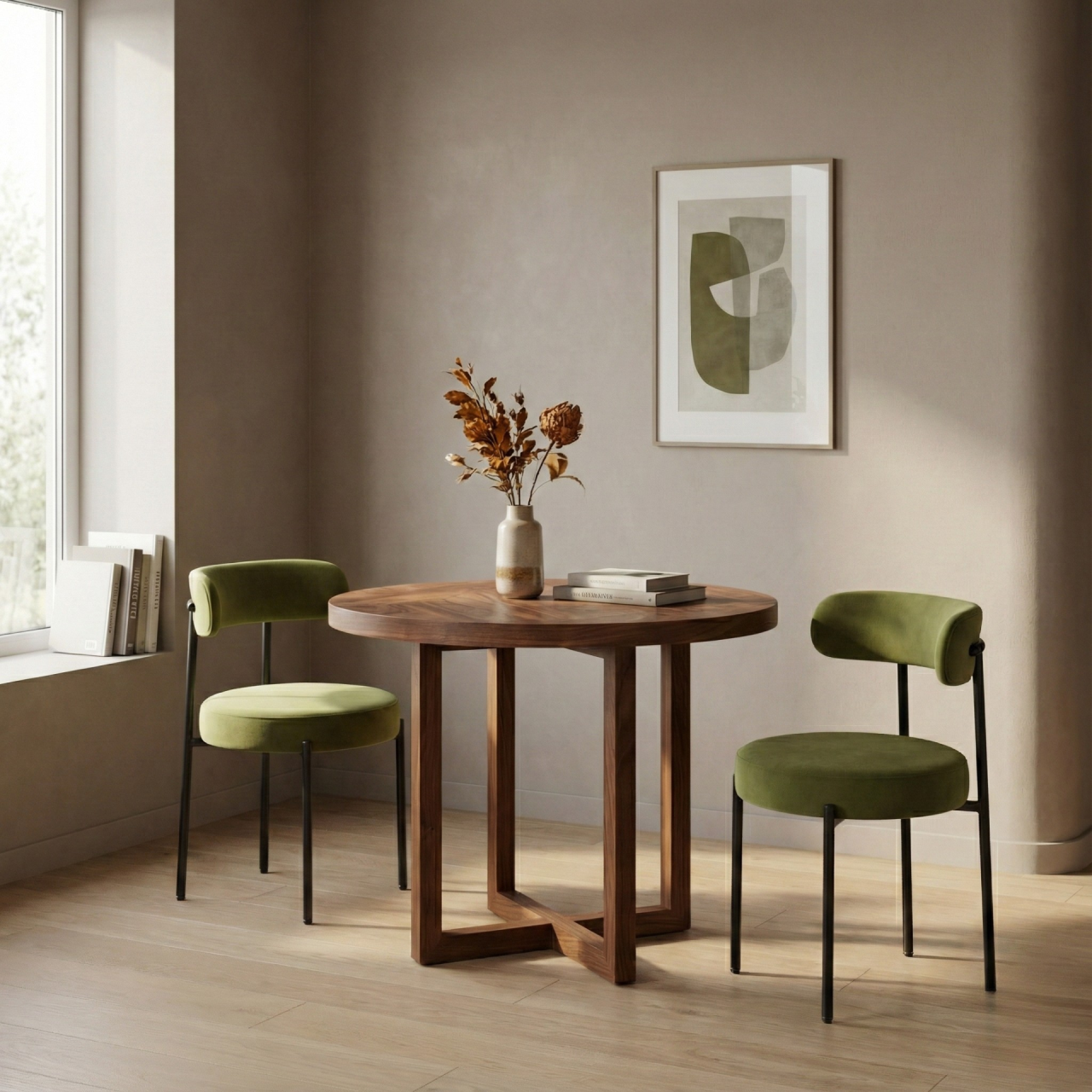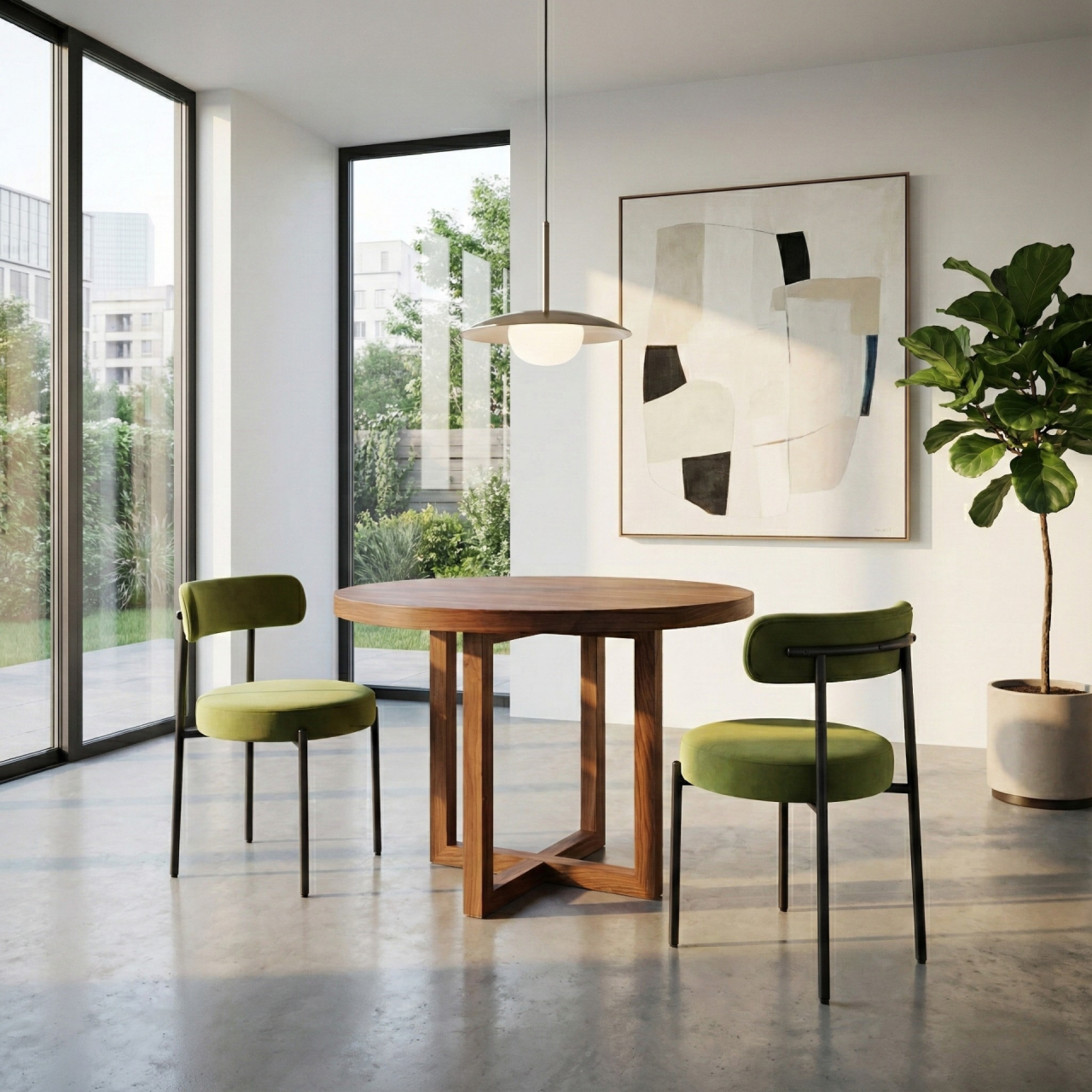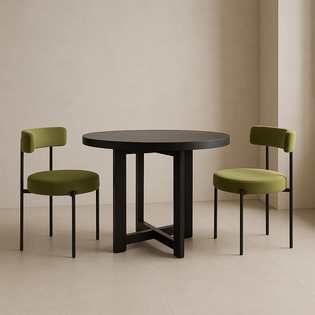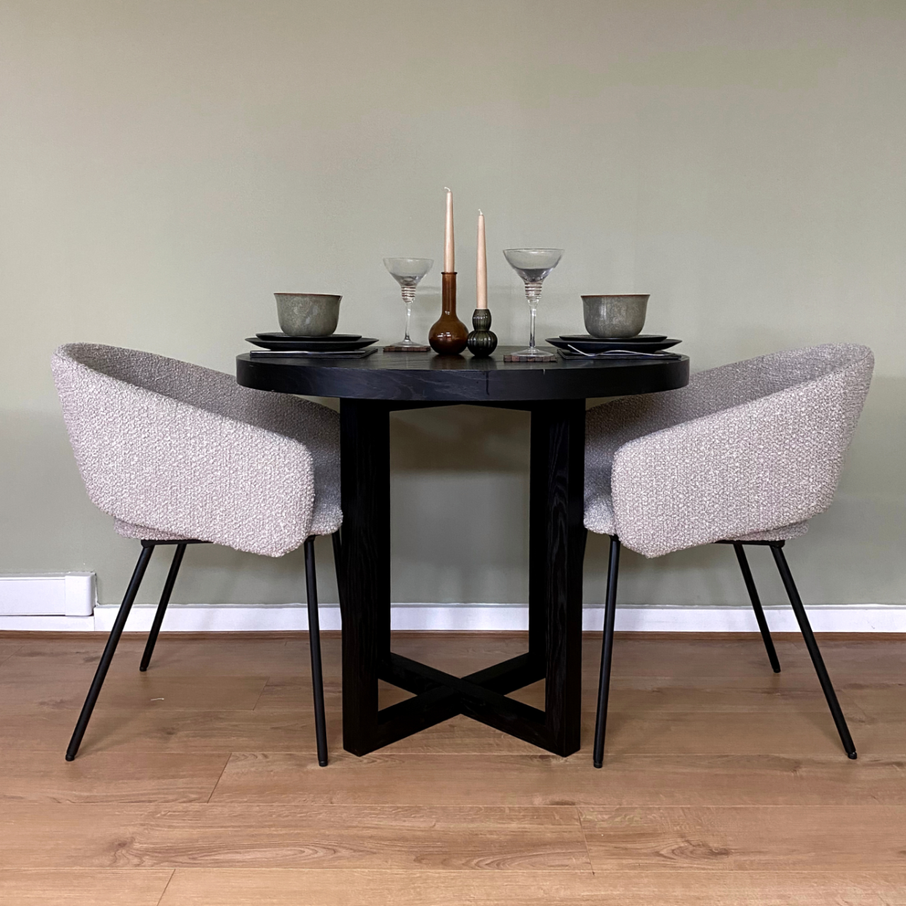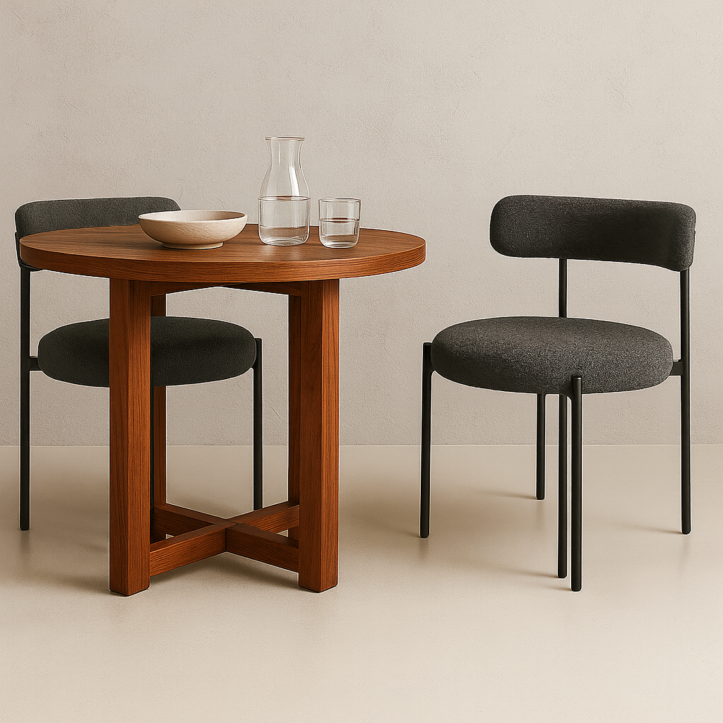 The Iris dining table has a cross stuctural design but is softened by the warmth and feel of the wood and looks good with the Lotus Dining Chairs.