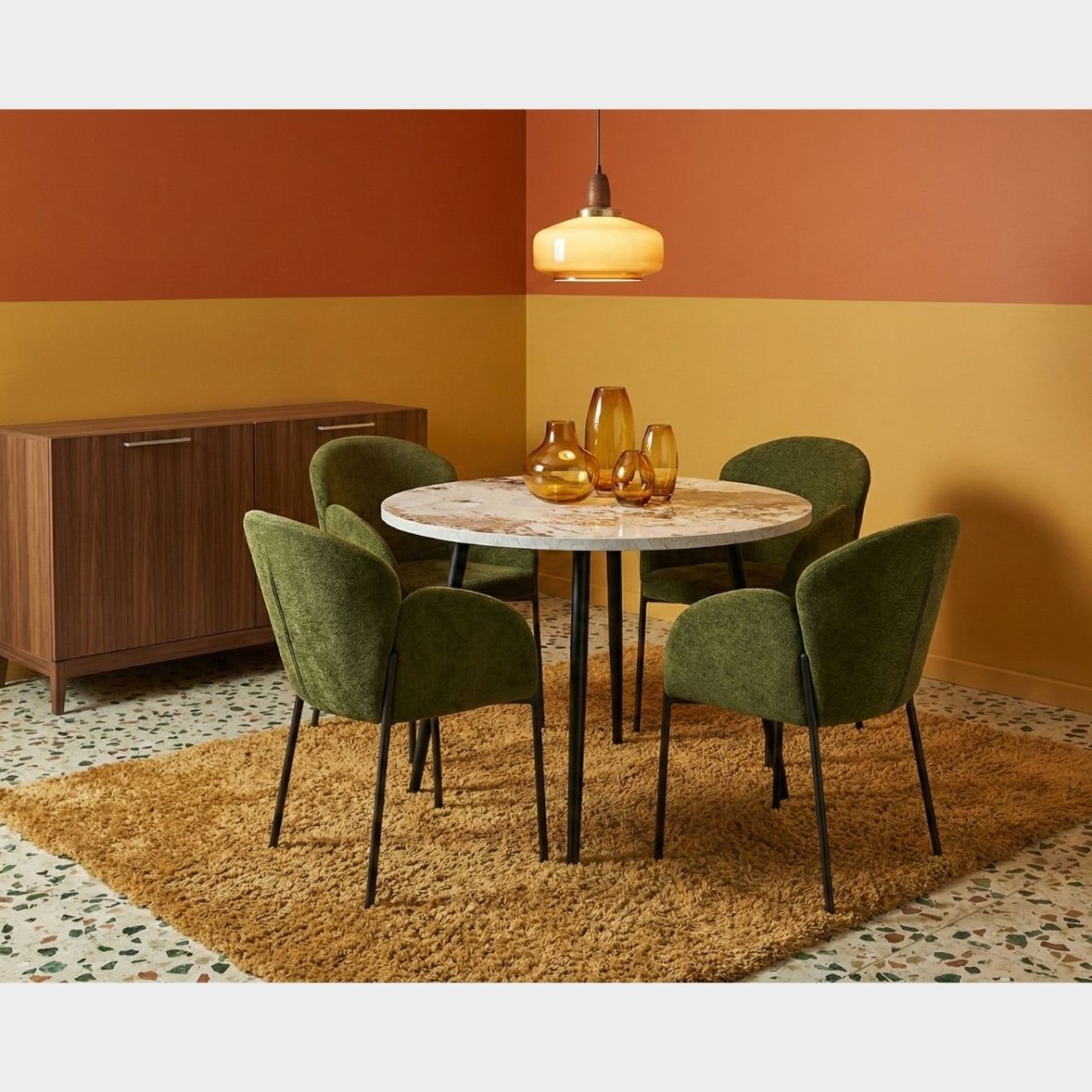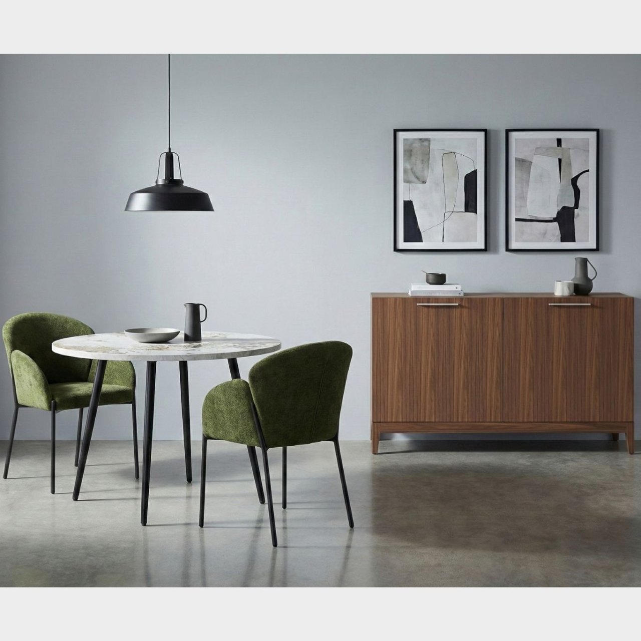 The Round Marble Dining Table is a refined, practical centrepiece for smaller dining spaces. Featuring a smooth marble-effect top, it brings an elegant, modern aesthetic combined with a durable, easy-to-maintain surface. The sleek, matt black powder-coated legs, subtly angle outward, adding a contemporary edge to the piece’s aesthetic. Designed to seat up to four people, this table is perfect for stylish everyday dining in modern interiors. Thoughtfully crafted from durable materials, it supports sustainable living while enhancing your space.