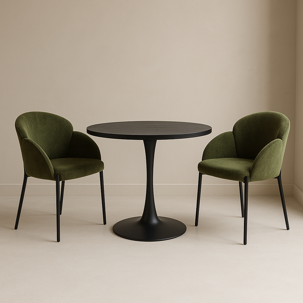 The Petal Dining Chair combines everyday functionality with a stunning design reminiscent of a blossoming flower. Its frame is made up of black, powder-coated metal, crossing under the seat and soldered to the legs which partially extend beyond the seat in the front and at the back. The chair is upholstered in flame-retardant fabric, creating a soft contrast with the metal legs. Ample cushioning adds extra comfort, while the backrest and armrests gently curve outwards and away from the seat, forming an inviting profile without sharp edges. Overall, the Petal Dining Chair is a versatile choice for contemporary dining spaces.