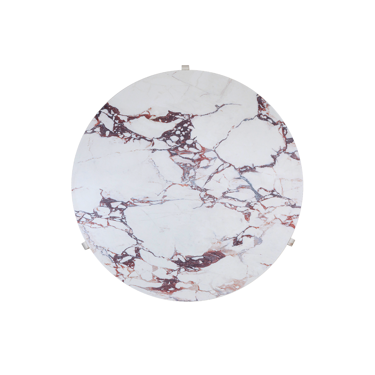 The Halo Coffee Table stands out with its sleek round design and a sleek marble-effect finish. Its circular design is complemented by three legs with rounded corners, extending beyond the tabletop's edge for a visually appealing overlapping effect. Smoothly finished edges and surfaces enhance the elegant aesthetic, making this coffee table perfect for living rooms. Designed with durable materials, it’s a sustainable choice for modern living.