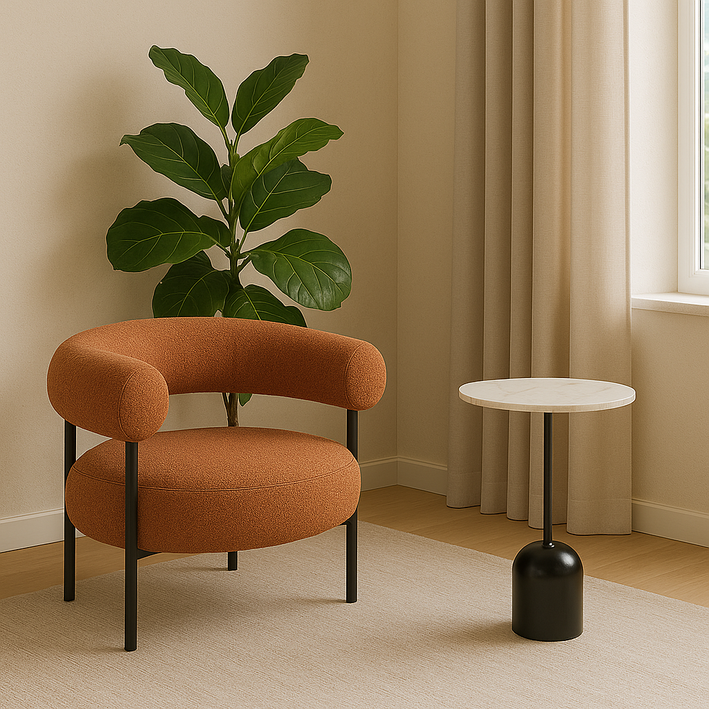 Comfort meets aesthetics in our stylish Eclipse Occasional Chair. It features a round, cushioned seat and a snug upholstered backrest which curves in a half-moon shape transitioning seamlessly into the armrests. The smooth, black metal legs provide long-term durability and a modern contrast to the soft upholstery fabric. Made with eco-friendly materials, this chair is designed with sustainability in mind.