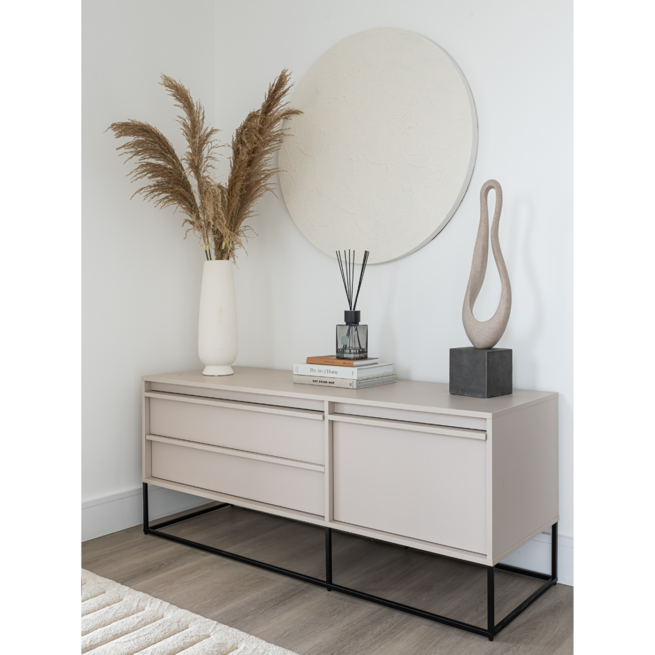 The Albion Sideboard features three drawers, offering exceptional storage. The left-hand side has two stacked drawers, while the right drawer is full-depth, perfect for bulkier items. The handles, crafted from the same material and finish as the unit, maintain the sleek design. Sturdy matt black powder-coated metal legs complete the look. It is made with high-quality, sustainable materials, ensuring both style and environmental responsibility.